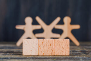 Marketing concept with wooden figures, cubes on wooden and grunge background side view.